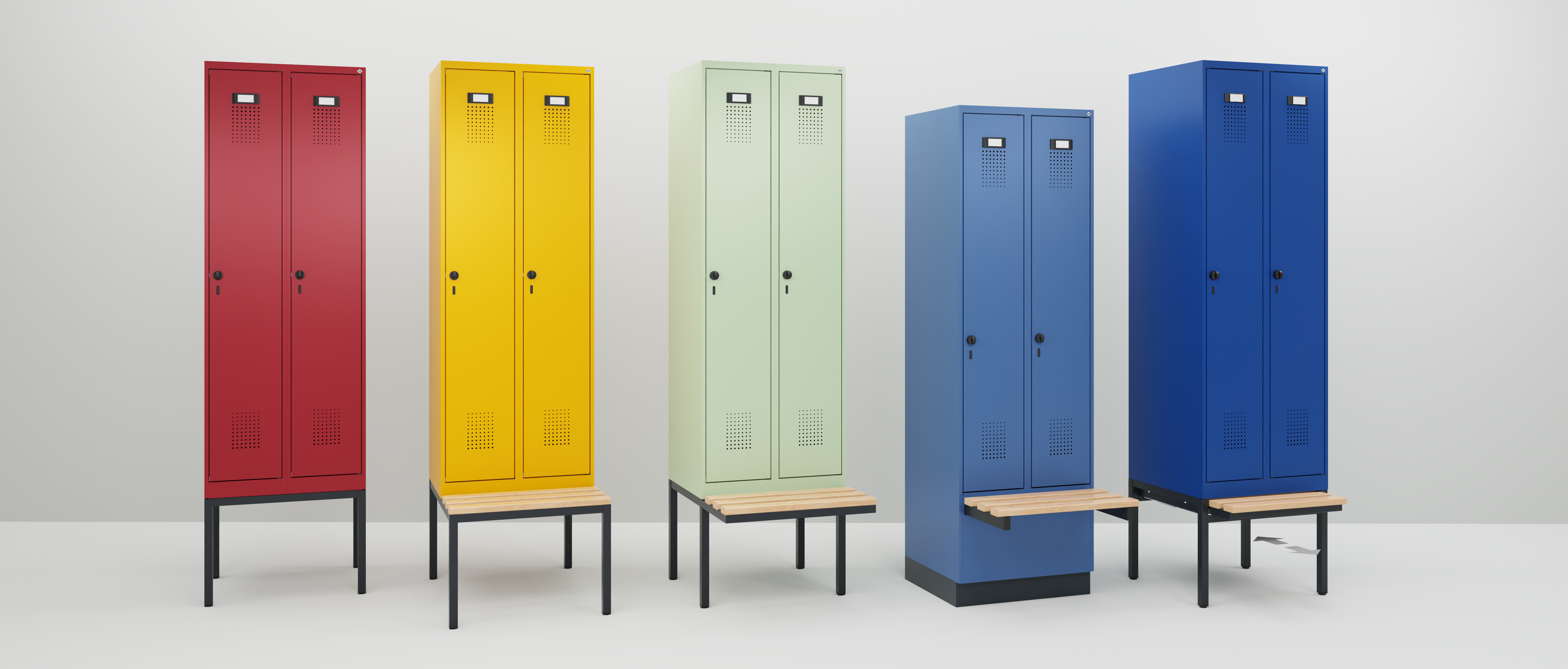 C + P offers a range of seating and coat rack benches that can be used in various industries. We offer changing room benches for sports halls, gyms, swimming pools and commercial or industrial facilities – you will find the ideal seating solution for every changing room here. The steel constructions of the coat rack and seating benches with durable baked-on coatings offer excellent protection against corrosion. Our benches are the ideal complement to lockers, completing the furnishing of your changing room.