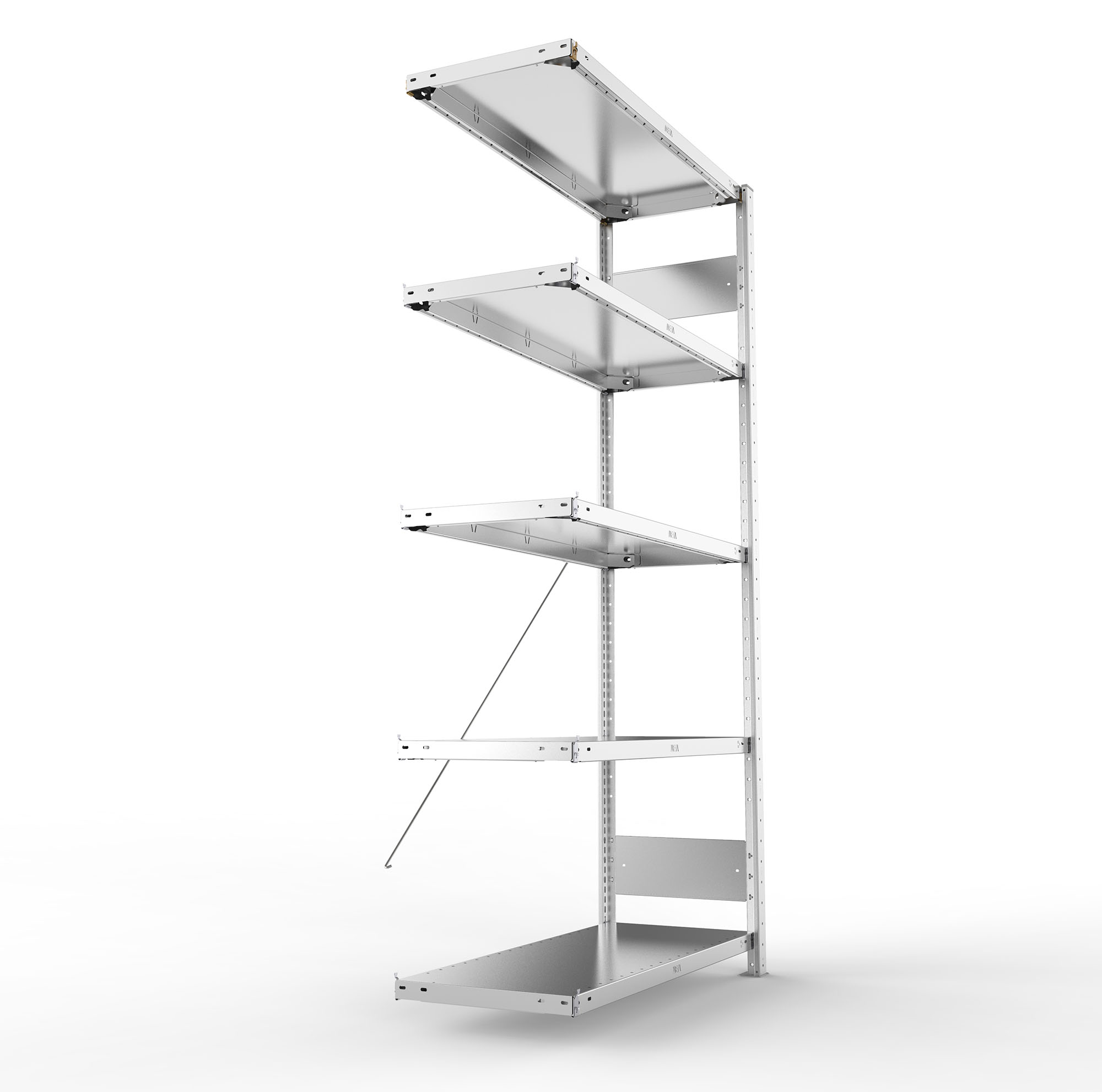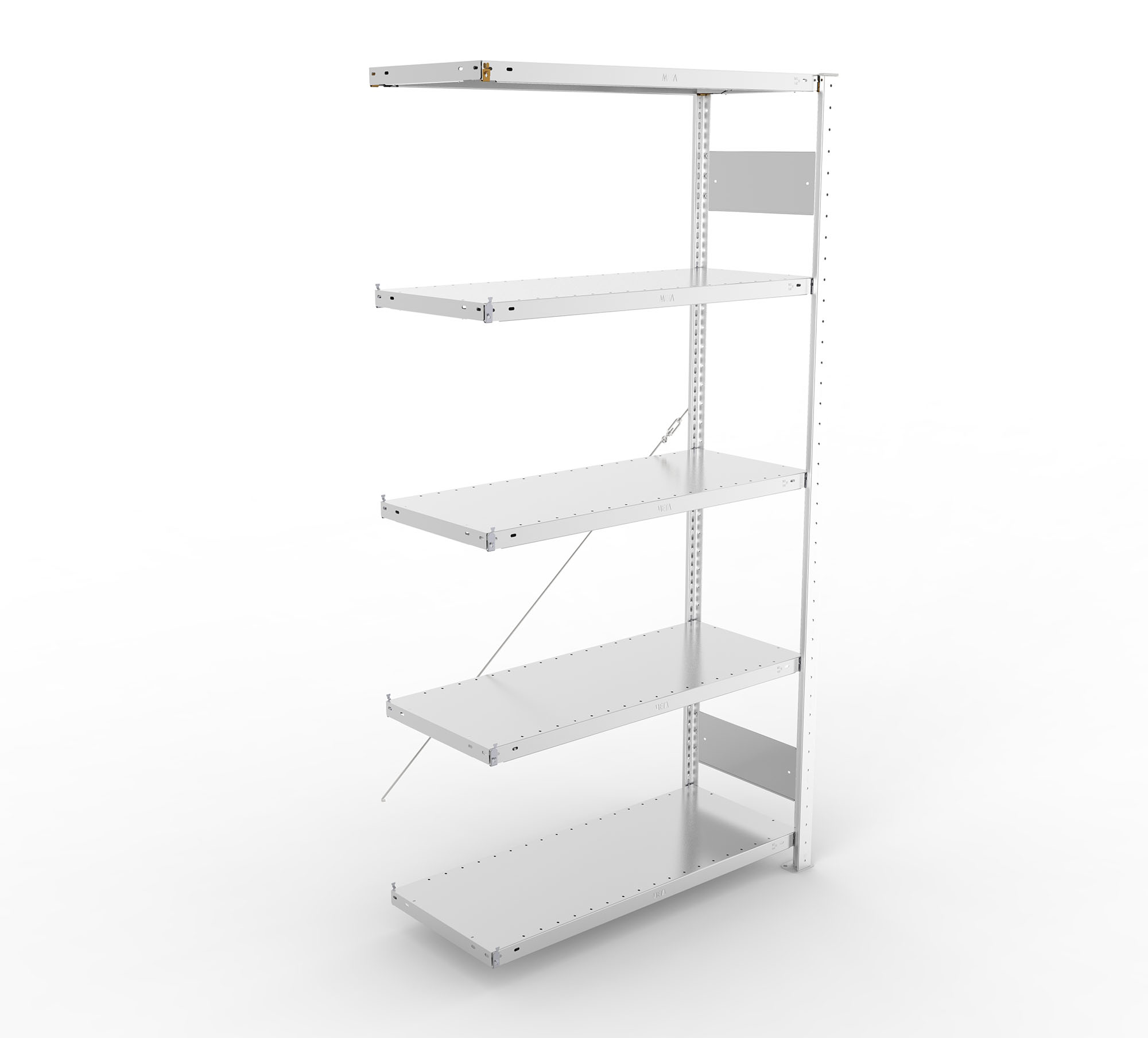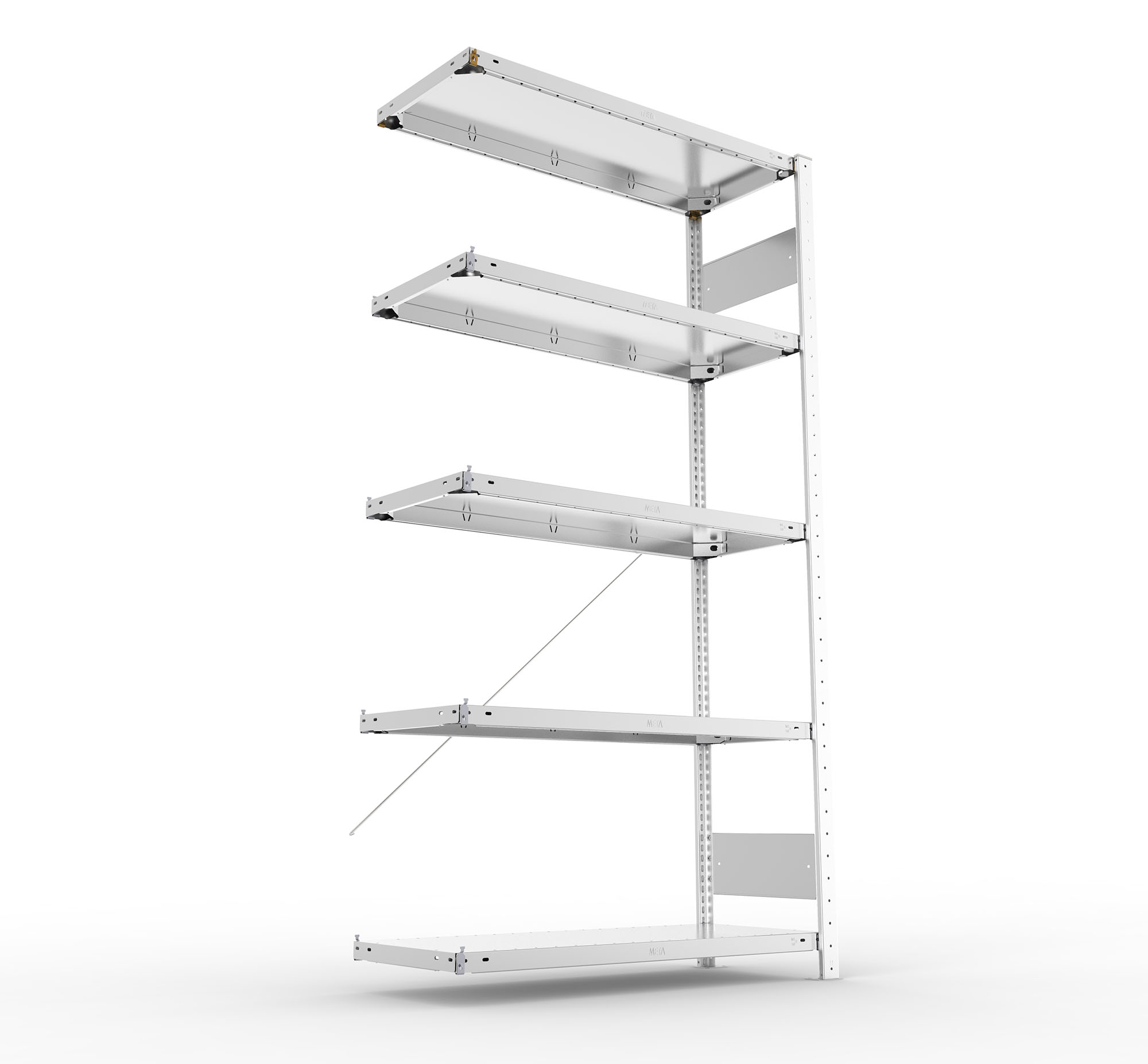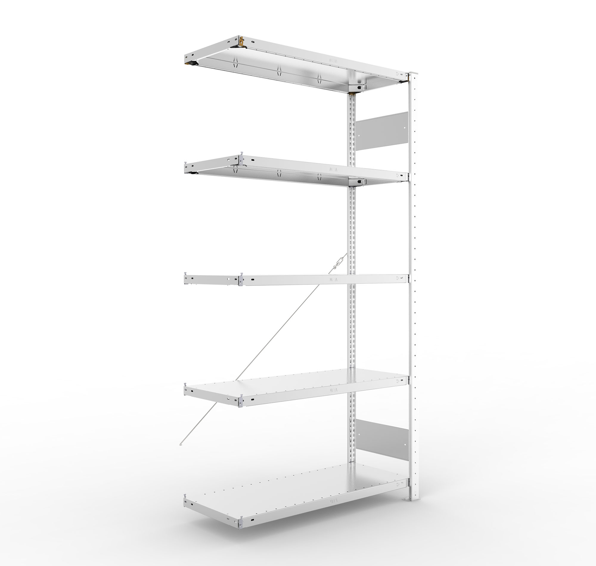 bestehend aus 1 Seitenrahmen, 4 Fachböden, 1 Diagonalstrebe mit Spannschloss bei Höhe 2000 mm, 2 Diagonalstreben mit Spannschloss bei Höhe 2500 mm (alle weiteren Maße siehe Grund-Steckregale)