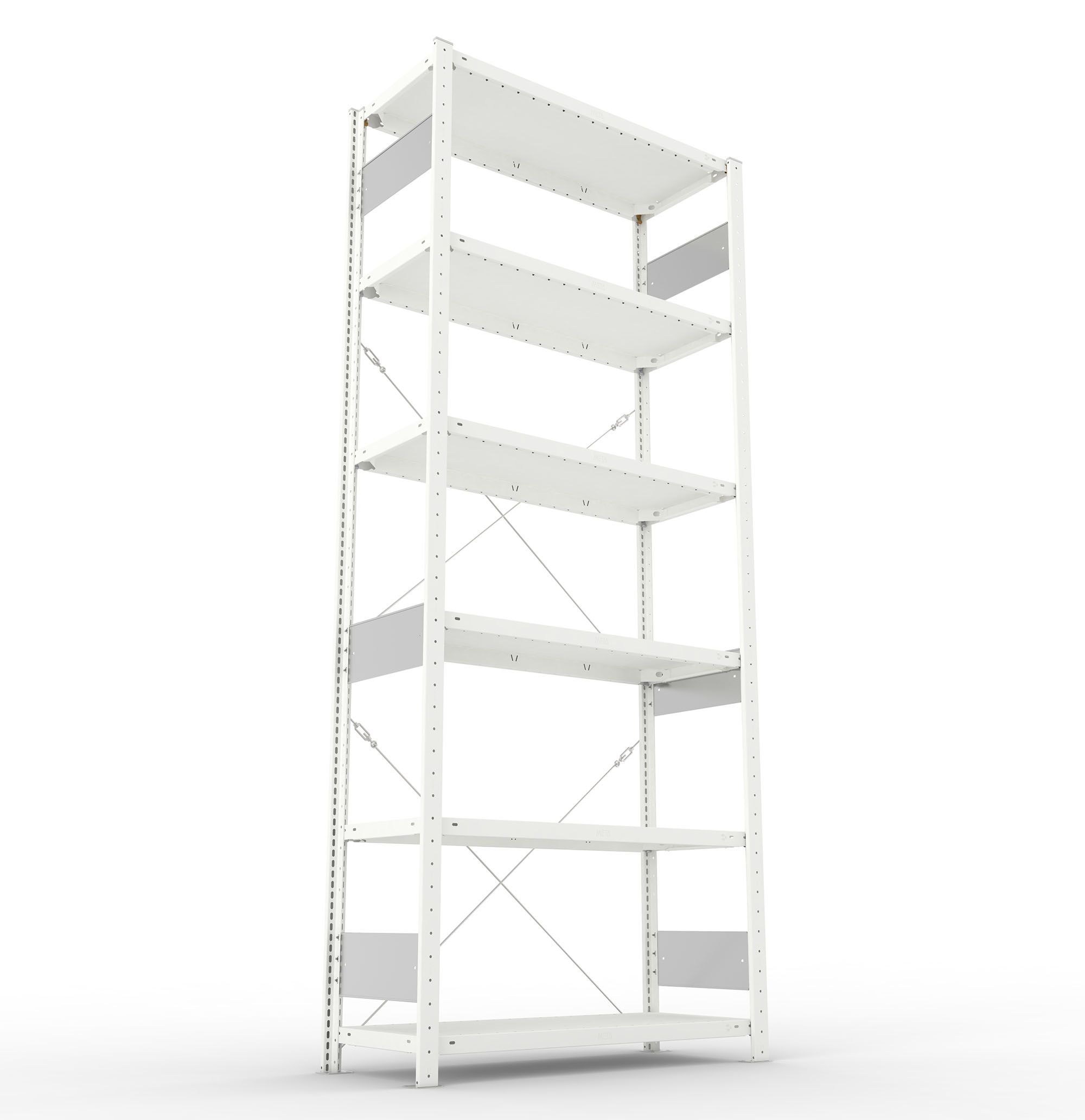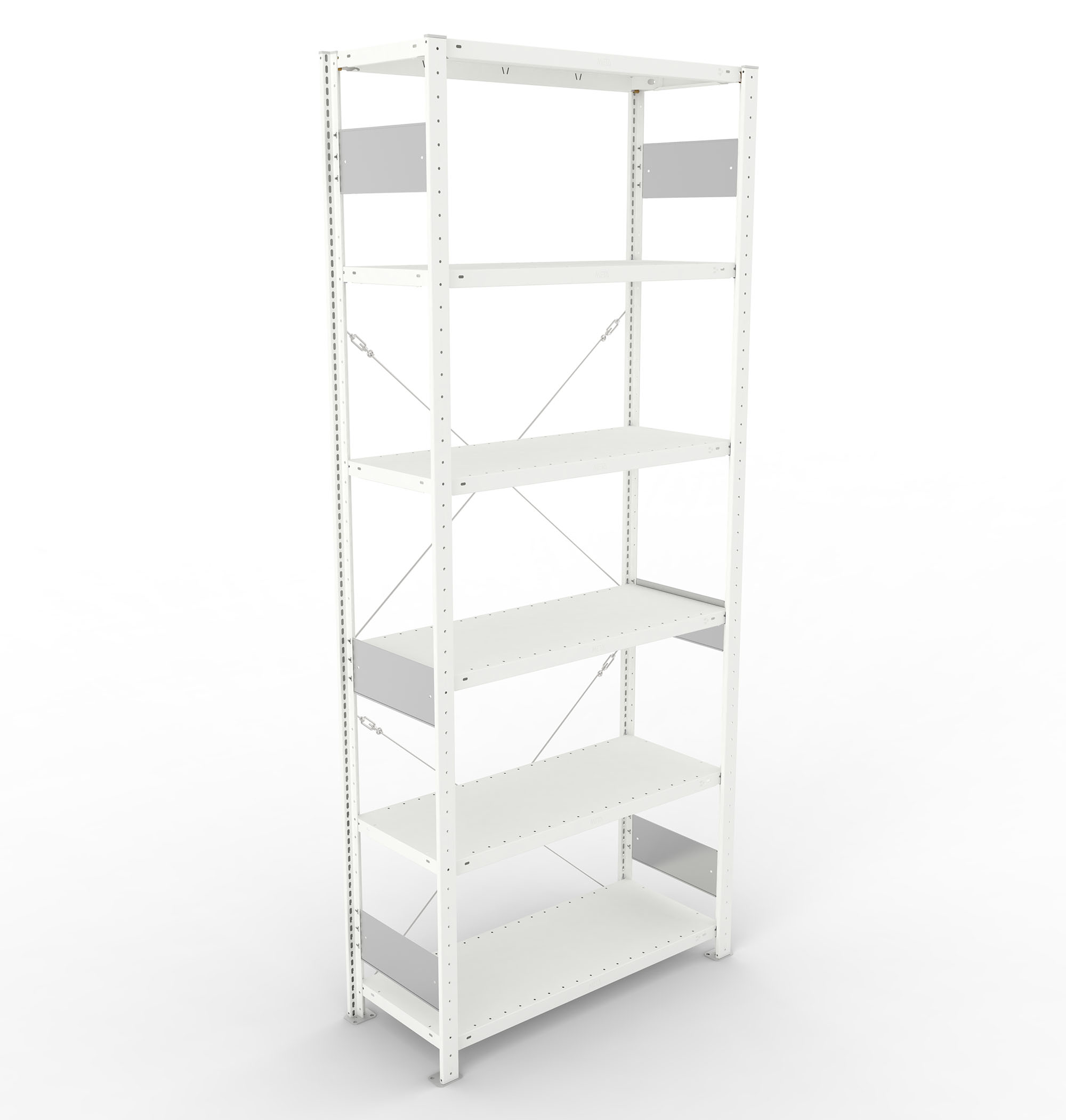 bestehend aus 2 Seitenrahmen, 4 Fachböden, 2 Diagonalstreben mit Spannschloss bei Höhe 2000, 4 Diagonalstreben mit Spannschloss bei Höhe 2500