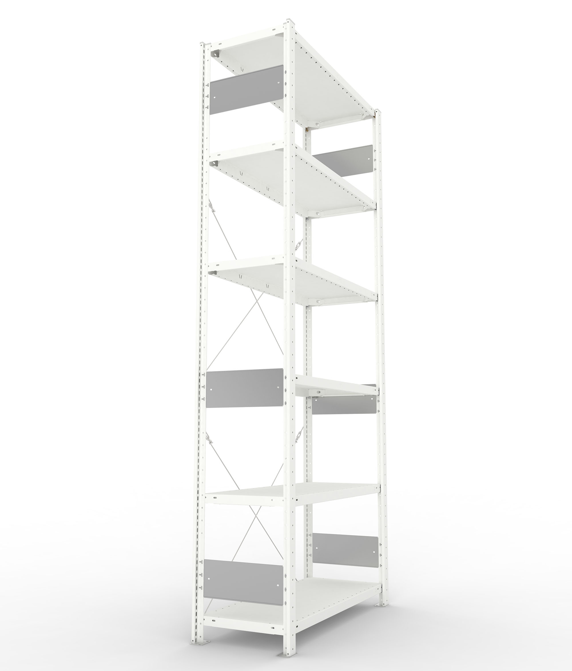 - Hohe Traglast je Fachboden: max. 150 kg + Feldlast: max. 1100 kg (Höhe 2000 mm) max. 1650 kg (Höhe 2500 mm) + Fachböden im 25 mm-Raster höhenverstellbar