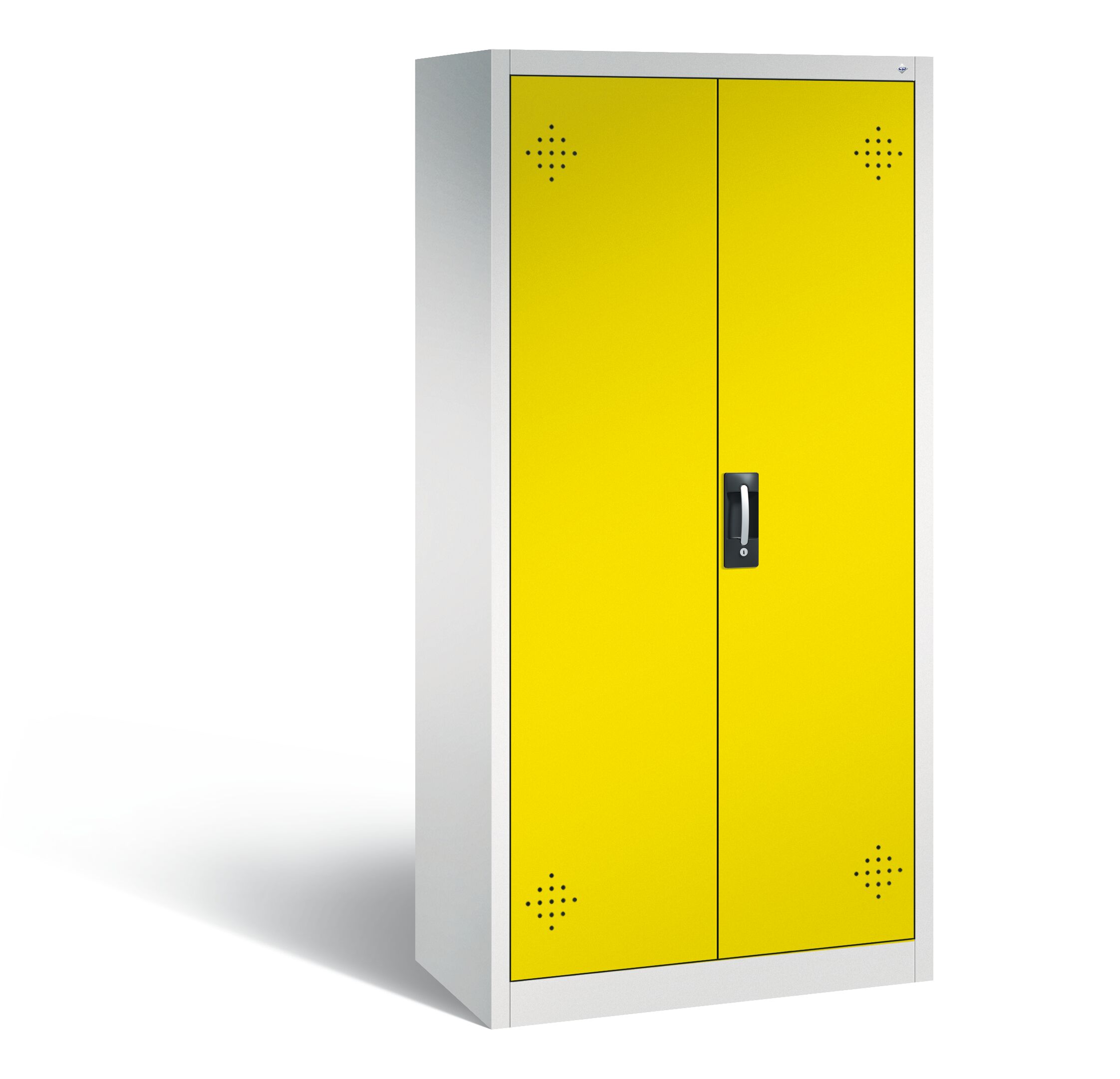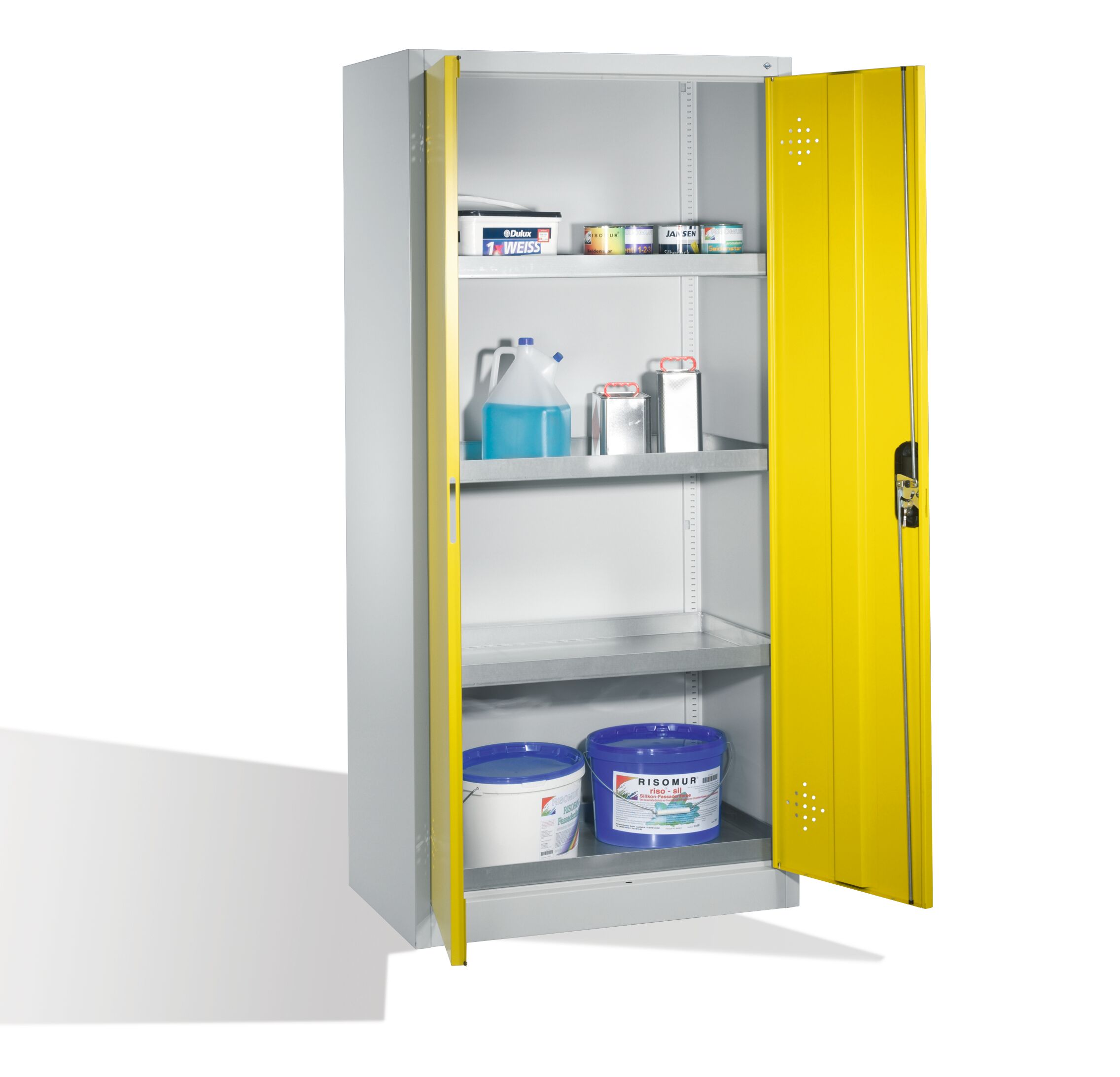 Stahl-Flügeltürenschrank Serie 89, als Umweltschrank, Korpus aus stabiler Stahlkonstruktion mit hochwertiger Einbrennbeschichtung für hohe UV-Beständigkeit, mit Kunststoffgleitern als praktischer Schrank- und Fußbodenschutz, hohe Flexibilität der Inneneinrichtung durch Höhenverstellbarkeit im 15 mm Raster, Türen verstärkt für hohe Stabilität, Türaufhängung in Drehbolzen mit Öffnungswinkel ca. 110 Grad, zueinanderschlagend für gemeinsamen Verschluss, je Tür mit Belüftungs-Lochbild oben und unten, 4 Auffangwannen verzinkt, Auffangvolumen ca. 20 Liter, 1 Ergonomischer Muldengriff Ergo-Lock 4.0 für optimale Bedienungssicherheit und Verschleißfestigkeit, 3-Riegel-Verschluss, mit Zylinderschloss und 2 Schlüsseln, Maße (H x B x T): 1950 x 930 x 500 mm, Korpus: RAL 7035 Lichtgrau, Türen: RAL 1023 Verkehrsgelb