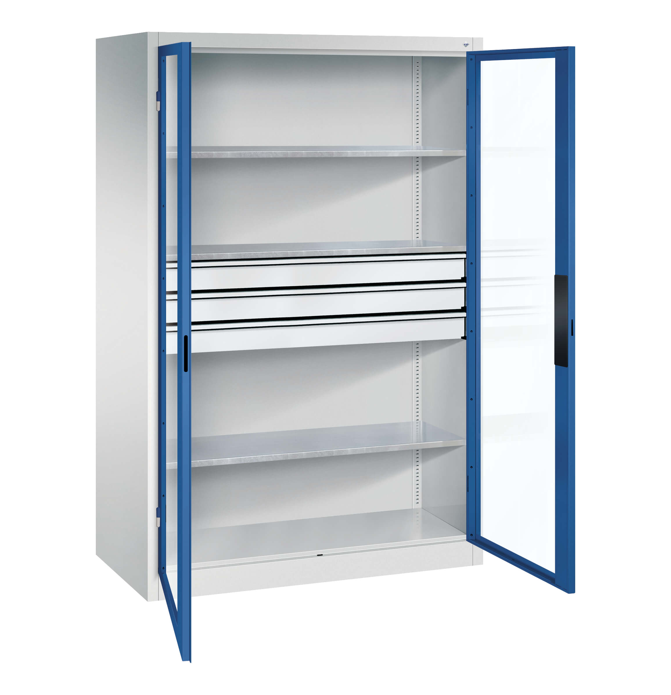 Our range of steel cabinets is distinguished both by the various types of cabinets we offer and their practical usability. The selection extends from furniture without doors for corners or small niches to large tool cabinets with plenty of space for all your utensils.