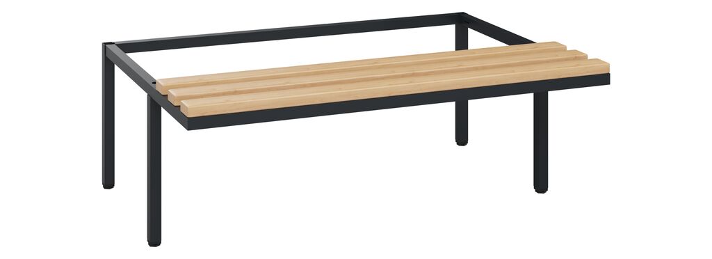 Untergestell mit schwebender Sitzfläche, Gestell aus stabilem Vierkant-Stahlrohr 30 x 30 mm, mit verstellbaren Bodengleitern für einfachen Niveauausgleich Sitzleisten aus Buche-Hartholz, im Profil ca. 60 x 30 mm, für guten Sitzkomfort, allseitig gehobelt, klar lackiert mit naturgegebenen Farbunterschieden, Maße (H x B x T): 420 x 1200 x 815 mm, Gestell: RAL 7021 Schwarzgrau