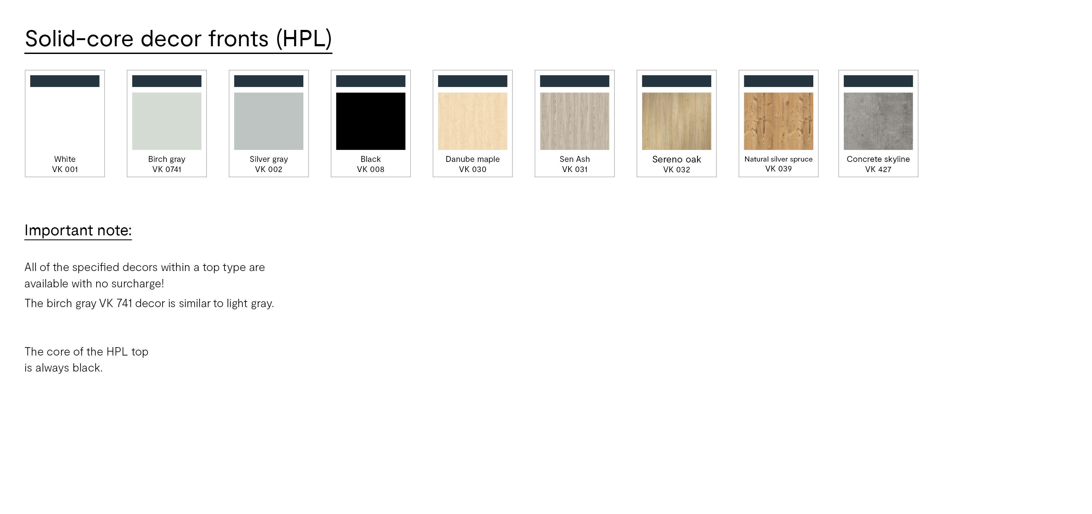 Our HPL decors combine premium workmanship, modern aesthetics and functional benefits – ideal for anyone who doesn’t want to compromise on design when it comes to steel furniture. These are solid-core decors known for their exceptional durability and distinctive solid-core black edge (13 mm).